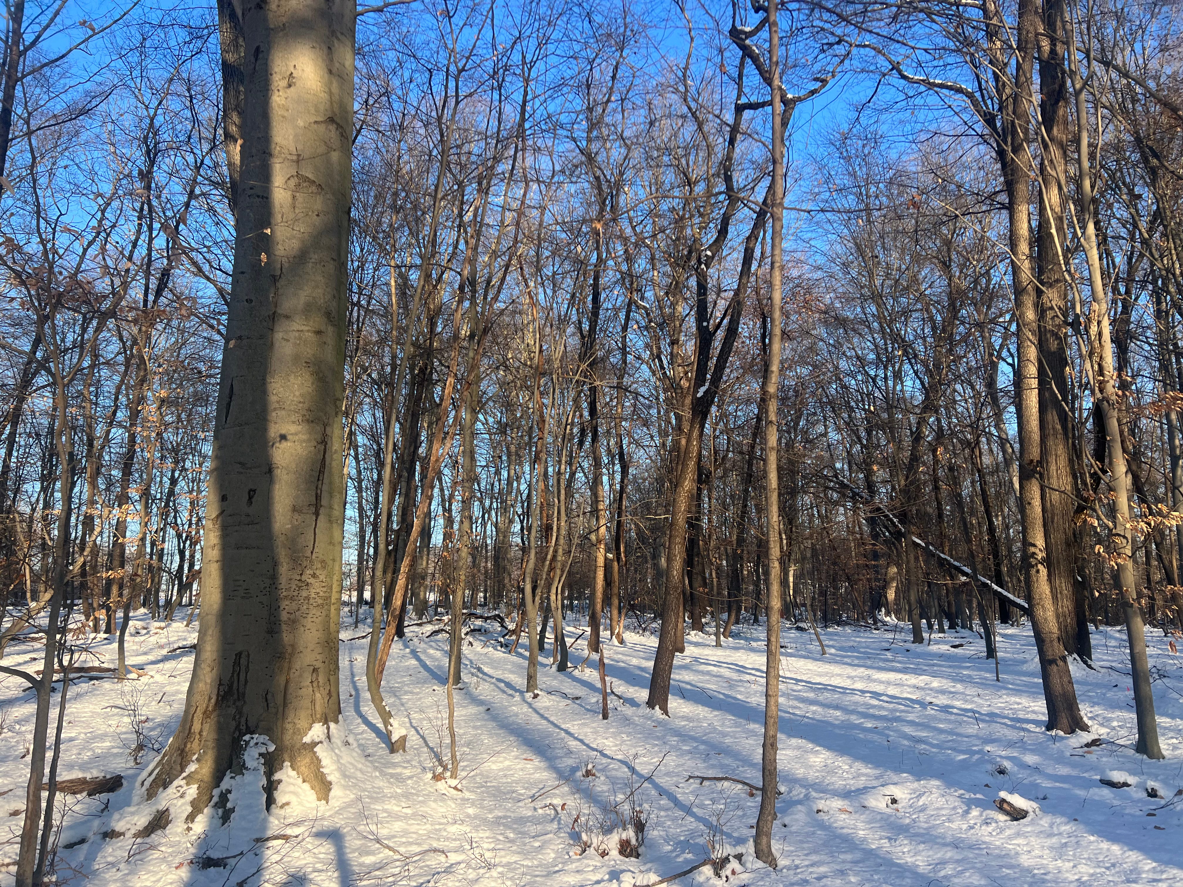 Thought where i live now is less rural then where i once roamed, there are fields and woods that someday i might know well. The river here is narrow, the woods don’t get dark. There aren’t any hidden, drinkable springs that i know of, and there are no cliffs. The fields are, in the very middle, quiet, but road noise is never far. For all that, there is this young stand of beeches Dolly and I run through, and beeches feed a great deal of animals, it seems, and the snow keeps their trails.